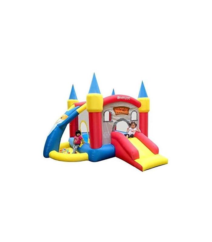 El Castillo hinchable es ideal para jardín, está compuesto por una zona de salto rodeado de paredes de protección con red, además dispone de una piscina de bolas (incluidas 30 bolas de plástico) tobogán y obstáculos. Las paredes están decoradas con animación infantil simulando que es un castillo. Medidas: 350 cm(largo) x 350 cm (ancho) x 245 cm (alto) Incluye: -Kit de reparación -Bolsa para guardar el hinchable -8 piquetas para clavarlo en el suelo -Motor de inflado 220 - 240 V Edad recomendada de 3 a 8 años Peso máximo permitido: 108 kg Máximo de jugadores: 3 Altura máxima: 0,90-1,50 cm Homologado para uso doméstico.