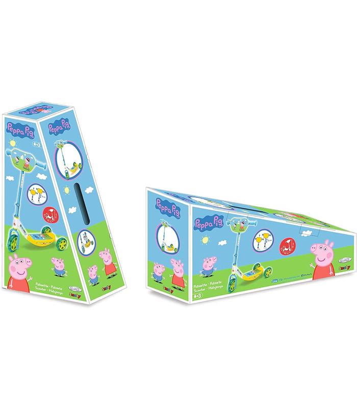 ¡Qué patinete tan bonito con estampado de Peppa Pig! Tiene 3 ruedas, lo que permite una mayor estabilidad al peque. El patinete se desliza tras impulsarse con un pie contra el suelo. Manillar regulable en altura en 5 cm. Dibujo de la base en IML para que no se pueda borrar. La estructura es metálica y cuenta con una bolsita para guarda cosas en el manillar. Peso máximo soportado 20 Kg. Dimensiones: 55 x 32 x 65 cm. Ideal para peques que se quieran introducir poco a poco en paseos en patinete, de 3 a 5 añitos.