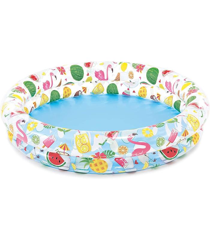 La piscina tiene 2 aros transparentes con ilustraciones veraniegas como frutas y helados