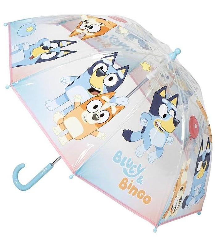 Diseño de cúpula tipo burbuja fabricado en material transparente con ilustraciones oficiales y coloridas de Bluey, ideal para que los niños mantengan una visión clara del entorno mientras están protegidos de la lluvia, brindando una experiencia segura y divertida al caminar.
