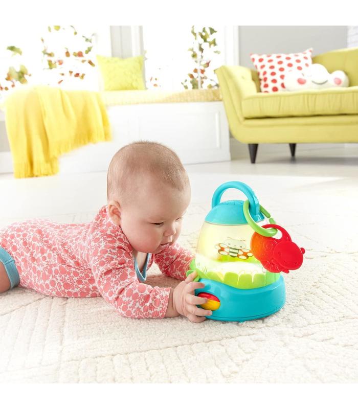 En la segunda etapa de juego, el niño puede dar golpecitos al juguete para que la luciérnaga se mueva más deprisa y para activar luces y melodías cortas que le animan a seguir interactuando con el juguete