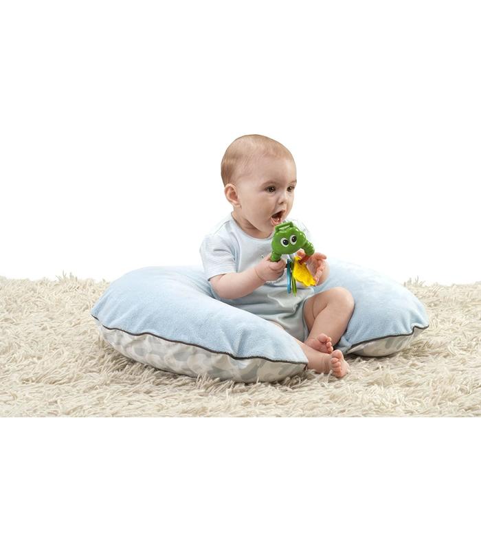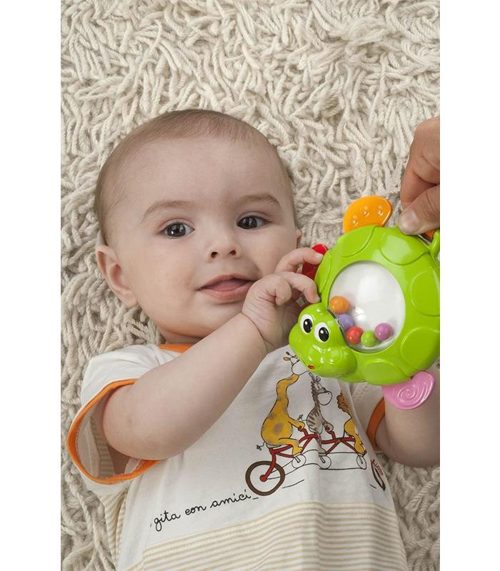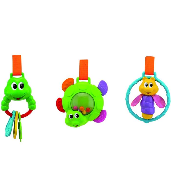 La rana fabricada en plástico blando es ideal para la dentición. La tortuga es un sonajero electrónico que ayuda a promover el conocimiento musical. La libélula con alas de tela ayuda al bebé a desarrollar su sensibilidad táctil