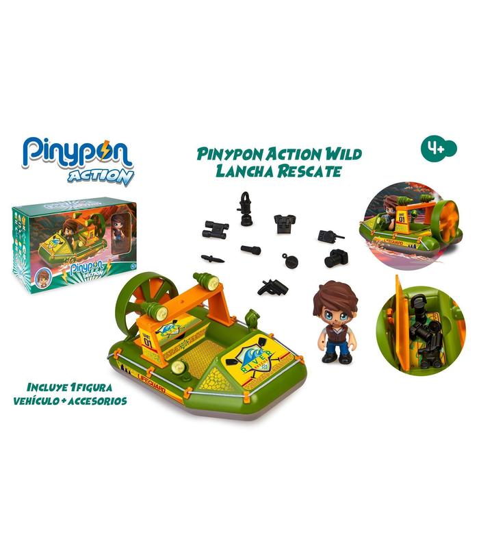 Lancha para explorar por los ríos de la selva Incluye 1 figura de explorador Pinypon Action La lancha flota en agua y mide 19 x 11 x 10 cm Con pequeños accesorios: prismáticos; walky talky; brújula, pistola; cámara y linterna Juguete para niños a partir de 4 años