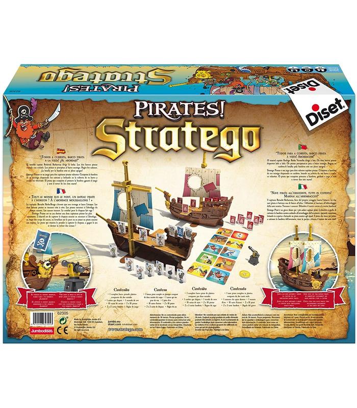 Juego infantil cuyo objetivo es abordar el barco pirata contrario, para conseguir su bandera. Una vez acabado el juego se pueden juntar las dos partes para guardar las fichas dentro. Contiene un barco pirata, 26 peones, 10 cartas, un cañón e instrucciones