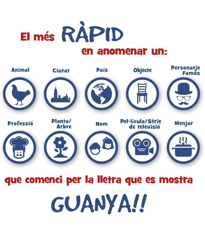 Divertit joc de cartes de doble cara; en una cara es representen les 10 categories del joc (animal, ciutat, país, sèrie de tv, objecte, nom propi, planta o arbre, professió, menjar, personatge famós) i en l''altra cara es mostren 3 lletres de diferent color; el més ràpid en endevinar una combinació guanya