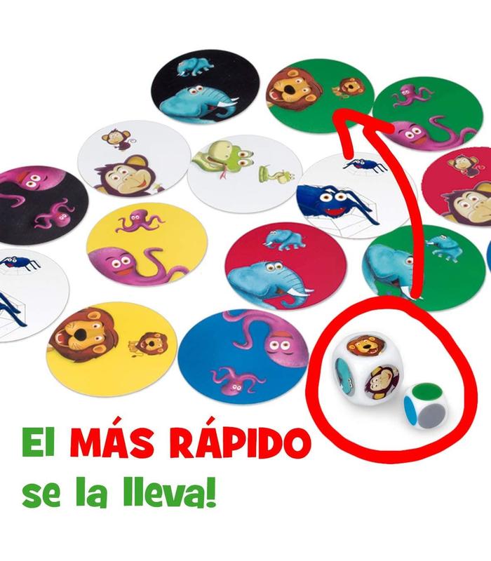 Demuestra que tienes los mejores ojos y las manos más rápidas en la mesa. Los dados indican la combinación de color y animal que debes buscar. Intenta ser el primero en coger la carta correspondiente.