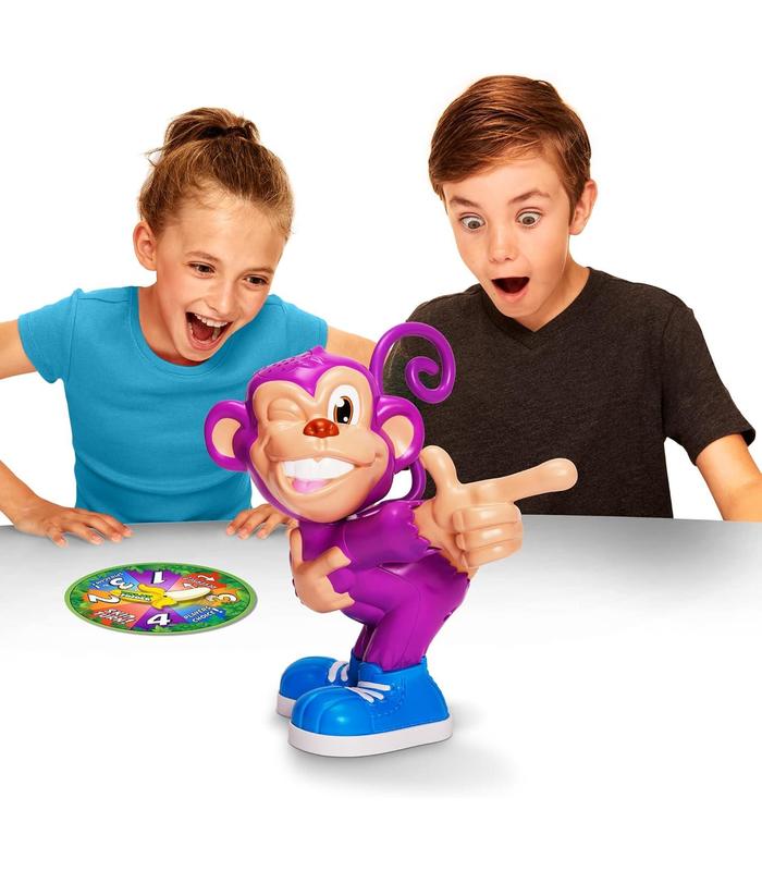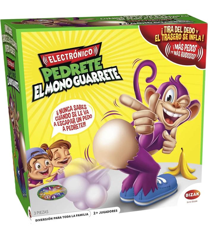 ¡Nunca sabes cuándo se le va a escapar un pedo! Pedrete el mono guarrete es un divertido juego que combina 2 cosas que hacen reír a todos, ¡el Mono y los Pedos! Gira la ruleta con el plátano, tira del dedo del mono Pedrete y ¡mira cómo se infla su trasero! ¿Cuánto tiempo podrá aguantar? Si provocas que el mono se tire un pedo, pierdes el juego. Para 2 o más jugadores. ¡Diversión para toda la familia!
