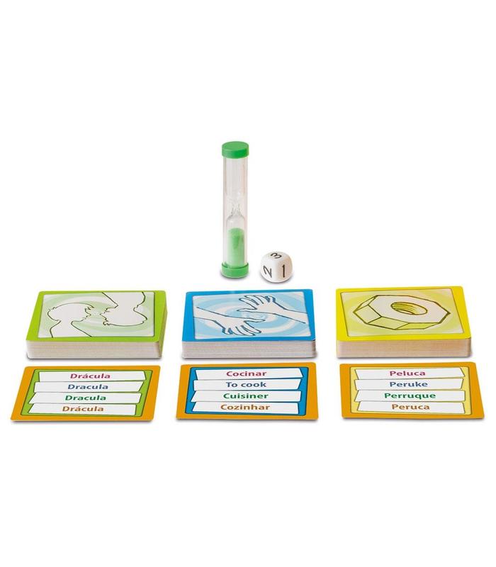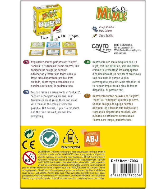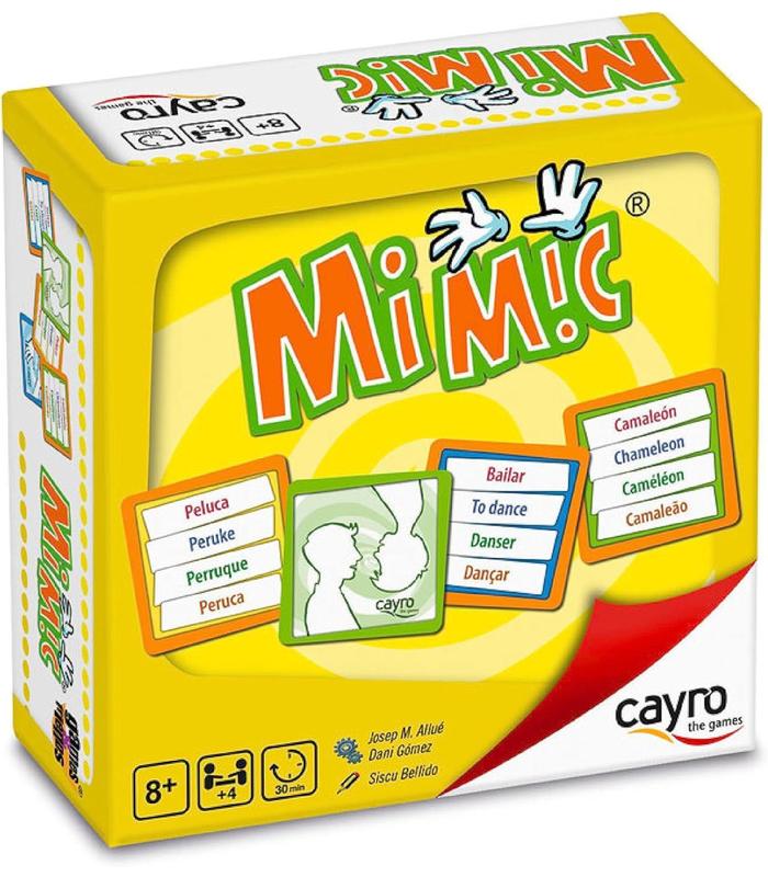 Mimic es un delirante juego de mímica y sonidos en el que, por turnos, un jugador de cada equipo, tendrá que representar el mayor número de palabras posible. El dado indica el número de palabras que se deberán interpretar, acertar y con las que formar una frase en un minuto. Si ha sobrado tiempo se puede arriesgar y volver a lanzar el dado para conseguir más tarjetas. Pero cuidado, que si te quedas sin tiempo y no se han resuelto todas las cartas que hay en juego se perderán tantas cartas como indique el dado en ese momento.