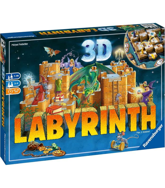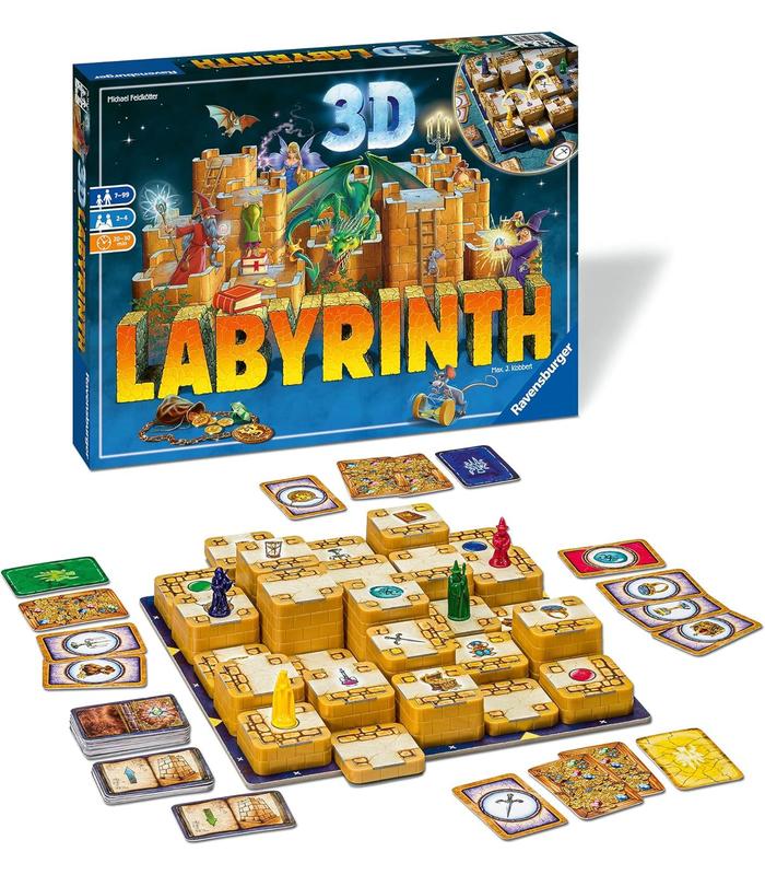 LABERINTO RAVENSBURGER: Uno de los juegos clásicos más queridos en el mundo; cada jugador gira en el laberinto en busca de su objetivo secreto, la dificultad para encontrar el camino correcto aumenta con los movimientos realizados por los oponentes