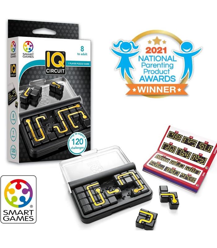 Coloca todas las piezas del IQ Circuit en el tablero de juego para crear circuitos. Cada reto muestra 2, 4 o 6 puntos de conexión; un circuito empieza y termina con un punto. Solamente hay una solución. Incluye 120 juegos en 4 niveles. Para 1 jugador a partir de 8 años. No recomendable para menores de 3 años, ya que contiene piezas pequeñas que podrían provocar asfixia en caso de ser ingeridas por el niño/a.