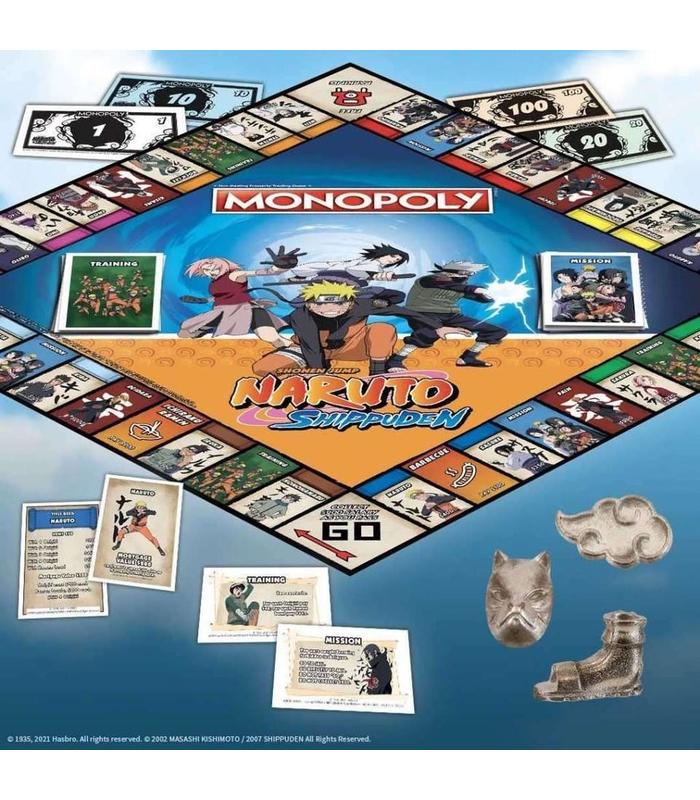 Conviértete en el shinobi más poderoso de esta edición especial de Monopoly: Naruto! Reúne a ninjas, coge las cartas de entrenamiento y misión, y desarrolla tus técnicas de ninja para evitar la bancarrota.