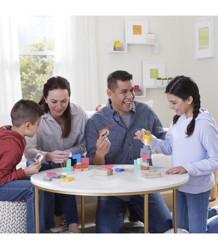 UN GIRO DEL JENGA CLÁSICO: En esta versión del juego Jenga, se construye de forma diferente. Los jugadores se dividen en equipos que compiten para construir objetos con los bloques de madera, al mismo tiempo y en el menor tiempo posible