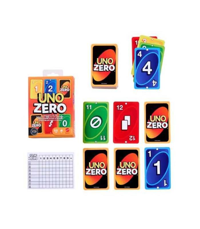 MATTEL GAMES UNO ZERO. El objetivo es conseguir la puntuación más baja posible e intentar llegar a cero. Los jugadores deben colocar las cartas boca abajo en una cuadrícula de 2x3 y tratar de intercambiar cartas de alto valor por cartas de bajo valor, para burlar a sus oponentes y conseguir la puntuación más baja posible. Los símbolos gráficos especiales presentes en cada carta ayudan a identificar el color o colores de esta, así podrán jugar sin problema las personas con cualquier tipo de daltonismo. Las cartas especiales como Cambio de sentido y Pierde el turno pueden revolucionar la partida. Diseñado para grupos de 2 a 8 jugadores. Edad: +7 años.