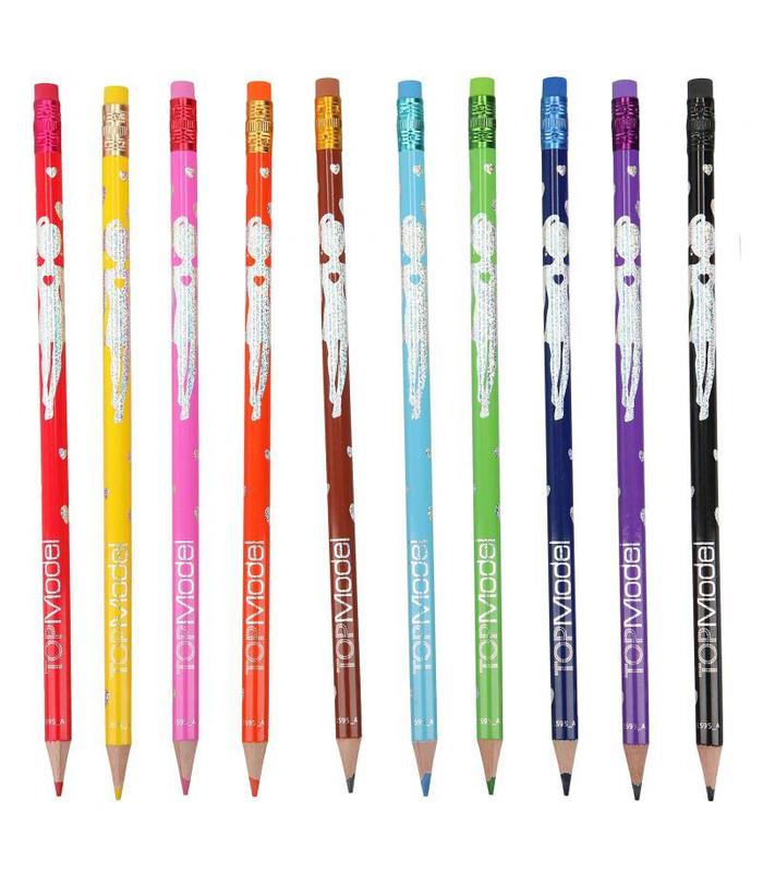 ¡Cuánto colorido! ¡Con estos diez lápices de colores no cuesta dibujar modelos de TOPModel, diseños chulos y dibujos fantásticos! Y lo mejor es que es muy sencillo borrar si te equivocas porque llevan una goma en el extremo. ¡Qué guay! Colores: amarillo, naranja, rojo, rosa, lila, azul oscuro, azul claro, verde, marrón, negro.