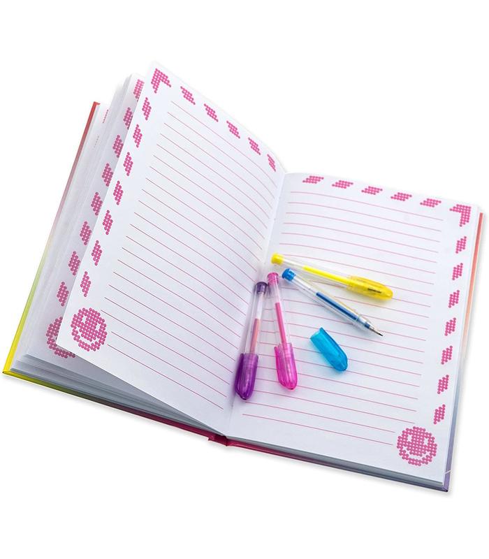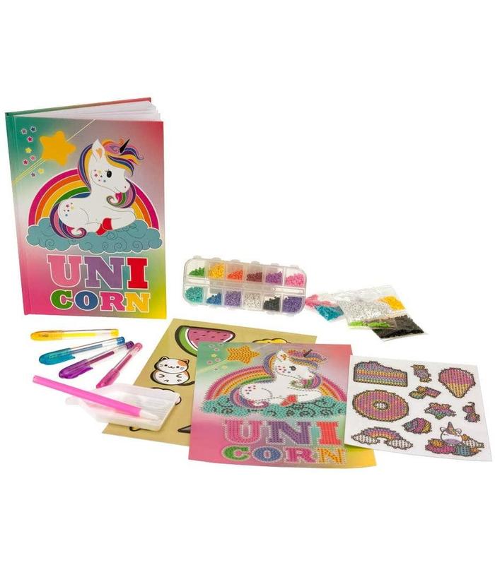 El conjunto contiene: 1 diario tematizado Unicornio con 80 páginas, una página adhesiva para decorar con las yemas y aplicar en la cubierta, una hoja de 10 pegatinas también para decorar con las yemas, 1 hoja de 8 pegatinas normales, más de 6000 gemas 3d de 12 colores diferentes, 4 lápices de color gel, contenedor para las yemas, set convaschetta y aplicador.