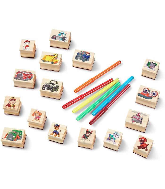 Crea incontables aventuras PAW Patrol con este set de sellos de 25 piezas de madera con bloc de actividades y marcadores