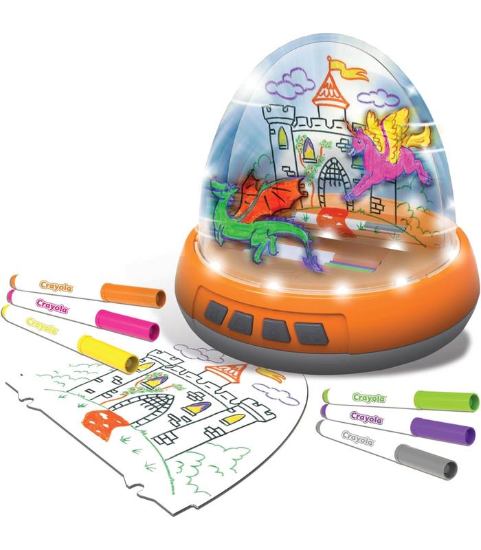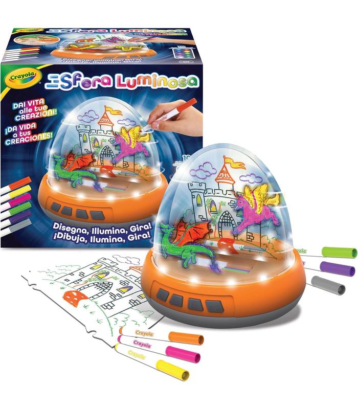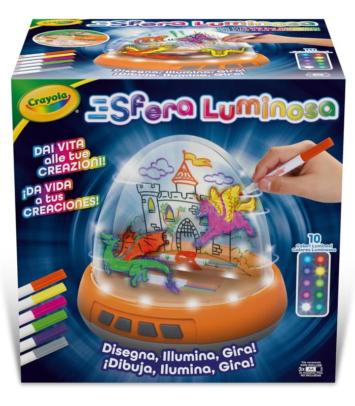 Contenido: Bola luminosa a pilas con colores, brillo y velocidad ajustables, 1 tablero de dibujo central, 6 rotuladores lavables, 2 escenas de muestra
