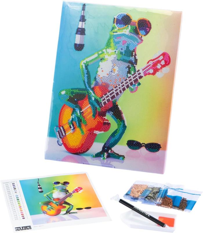 Técnica: para decorar el mosaico en forma de cuadro Canvas Rana con guitarra para colgar debes utilizar la técnica "Crystal art, colorea con números", aplicando las gemas a los números. La hoja de instrucciones te guía en la aplicación.