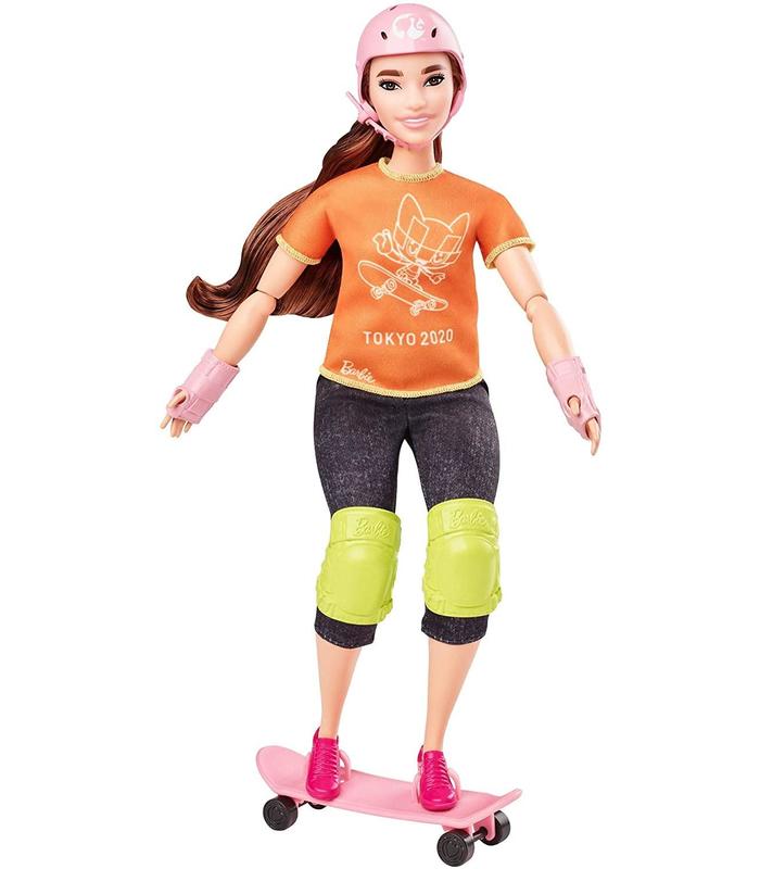 El monopatín, junto con la muñequera y las rodilleras, hacen que la muñeca Barbie esté lista moverse por las rampas y conseguir el oro