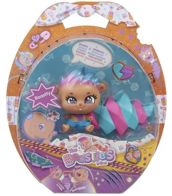 ¡Ya están aquí las nuevas mascotas traviesas de las Bellies! Se alimentan de fruta y guardan todas sus adquisiciones en su increíble casa árbol. No te asustes con sus rugidos, pues a Roasty le apasiona rugir y dar sustos, hasta tal punto que es su travesura favorita. Puede parecer peligroso con su cresta y cola puntiaguda y es que en el fondo es todo un rompecorazones. Cabe señalar que el muñeco Beastie Roasty trae un pañal y un corazón. Está recomendado para peques mayores de 3 años y para que emita sus rugidos se necesitan 3 pilas LR44.