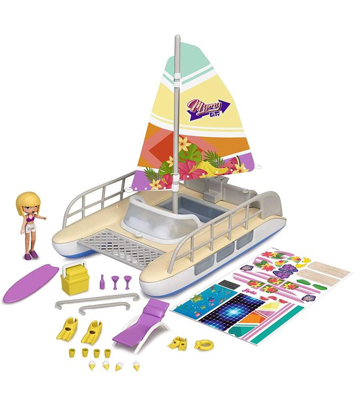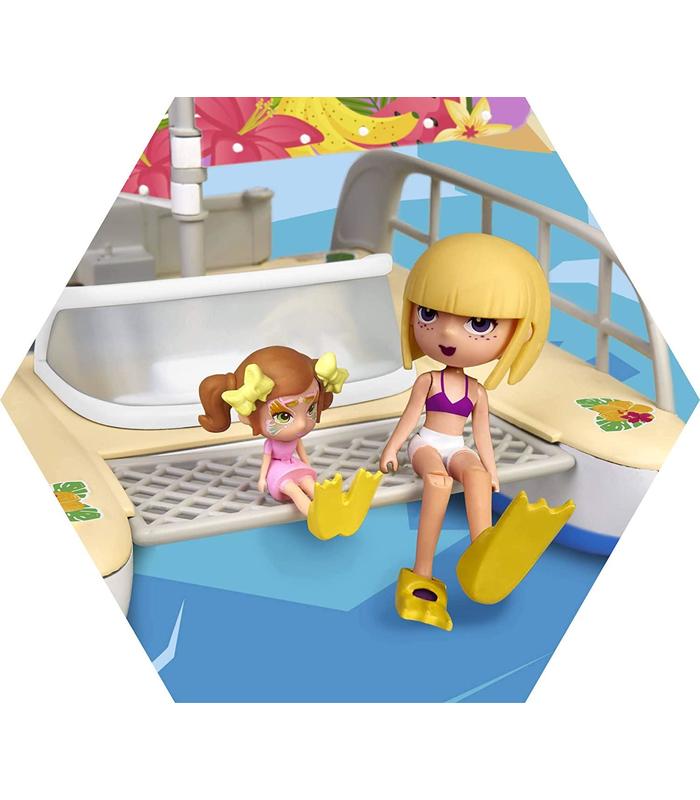 El catamarán incluye de 15 accesorios realistas: gafas de buceo, una botella con vasos, 4 helados, una neverita de picnic, un flotador, dos aletas y una tumbona; depondrás personalizarlo con las diferentes pegatinas que vienen incluidas
