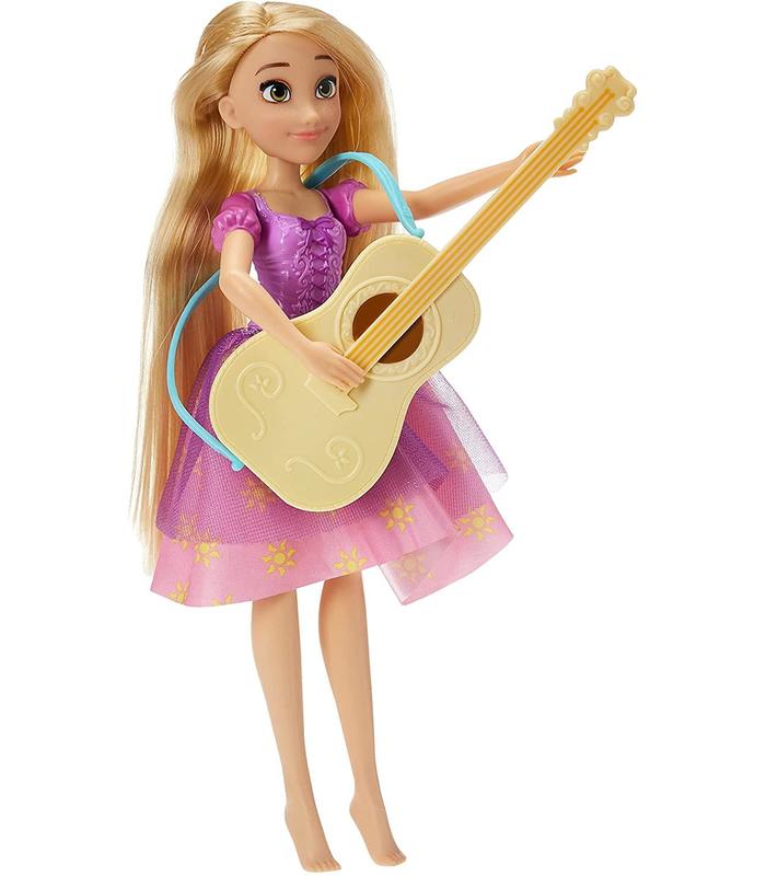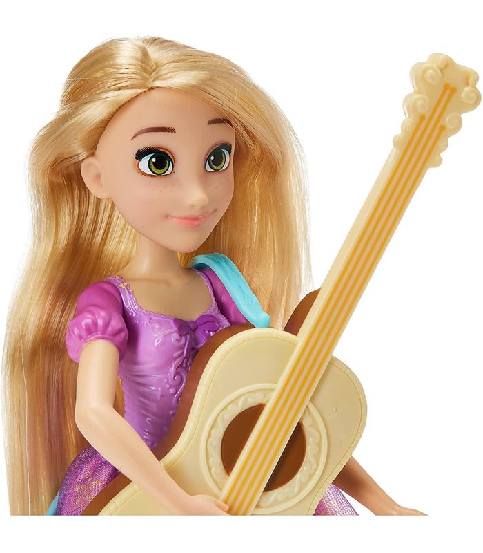 RAPUNZEL Y SU GUITARRA QUE CAMBIA DE COLOR: Este pack presenta a la princesa Rapunzel en un vestido morado y con una guitarra que cambia de color bajo el sol