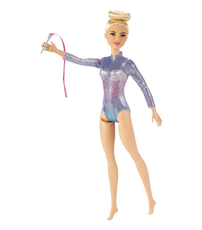 La muñeca Barbie Gimnasta rítmica (30,40 cm) viste unos llamativos leotardos metalizados y un bonito moño, y está lista para practicar su rutina.