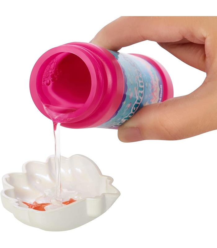 Incluye muñeca (17,8 cm), figura de delfín, solución de pompas, bandeja con forma de concha marina.