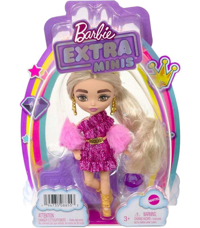 Esta muñeca Barbie Extra Minis tiene una melena rubia extralarga, adornada con una corona dorada, un vestido rojo brillante con volantes, un bolero de pelo sintético rosa y unos zapatos con gemas.