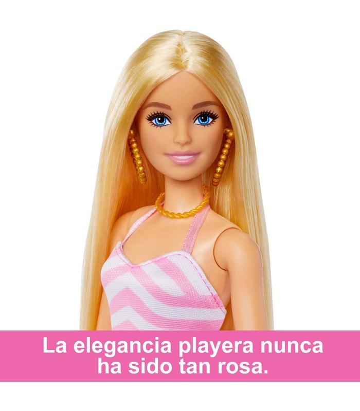 Relájate en la playa con esta muñeca Barbie. Su genial atuendo y sus accesorios temáticos inspirarán a niños y niñas a soñar con todo tipo de historias veraniegas bajo el sol.