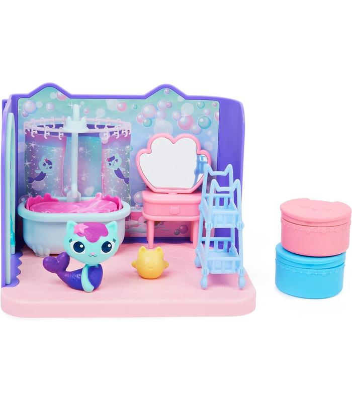 CAJA Y ACCESORIO SORPRESA: Descubre un gatito de goma para el baño, un perfume y un turbante de toalla con mascarilla de pepino que Siregata puede ponerse para jugar infinitamente en el Baño de La Casa de Muñecas de Gabby