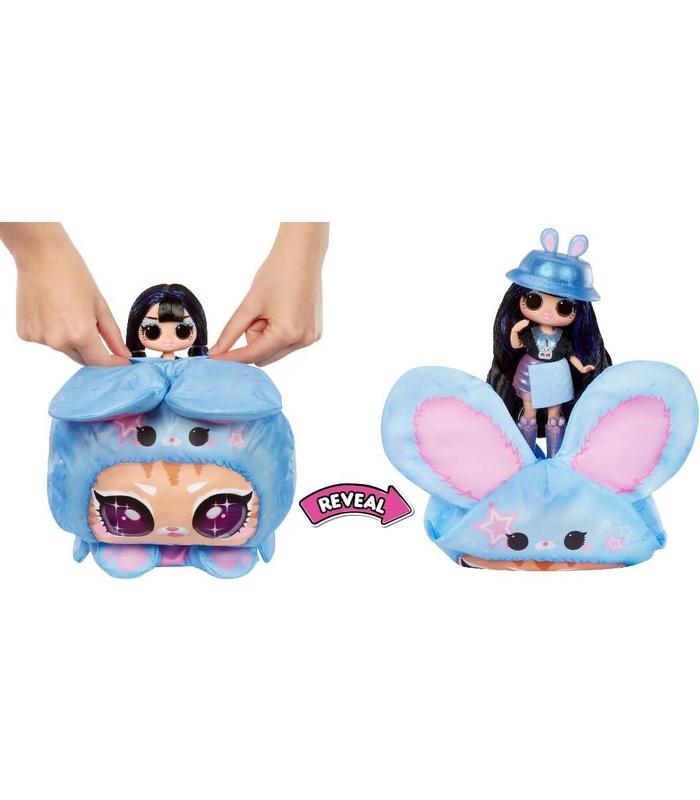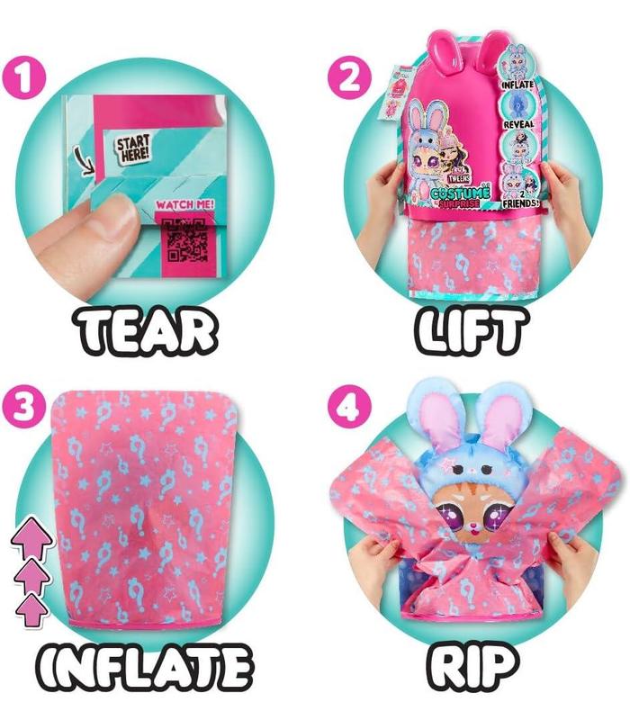 Extravagantemente divertido con capas de sorpresas: Primero rasga la cremallera en la parte inferior del embalaje y levanta la carcasa rosa exterior para revelar un misterioso papel de regalo. Mira cómo el papel se vuelve más grande y lleno y una vez completamente inflado, abre el papel para descubrir tu encantador disfraz de conejo azul. ¡Pero espera, la sorpresa no se detiene ahí! Deshaz el velcro de la parte posterior de la cabeza del conejito para descubrir tu hermosa muñeca Tweens Aya Cherry escondida en el interior