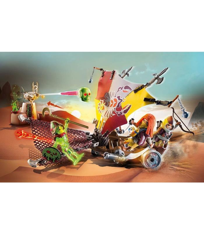 Gracias a su ágil vela, pueden aprovechar el viento y lanzarse por las dunas en atrevidas maniobras. Con la red desplegable pueden atrapar a los atacantes o buscar en las dunas escorpiones y su valioso veneno. Incluye nuevos proyectiles de esponja y personajes Ahari.