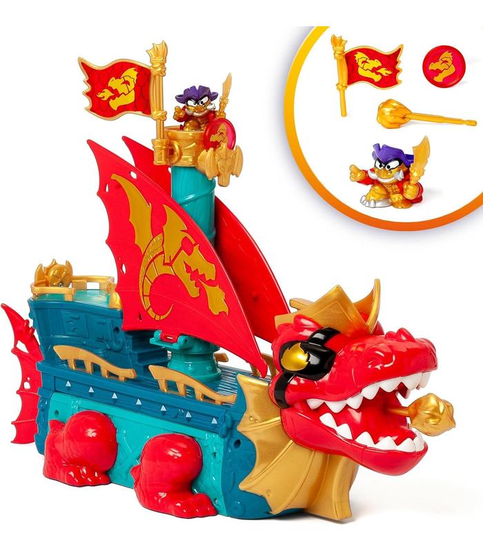 TODO TERRENO – 3 en 1: Dragon Ship puede surcar los Siete Mares gracias a su casco aerodinámico y su fuerte timón en la cola: muévelo para dirigirlo por el agua en busca de nuevas aventuras. ¿Tierra a la vista? Utiliza la moneda exclusiva para transformarlo en dragón y así desplazarte por la playa o la jungla. Y en cuanto te hayas hecho con el tesoro… ¡despliega sus alas y a volar!